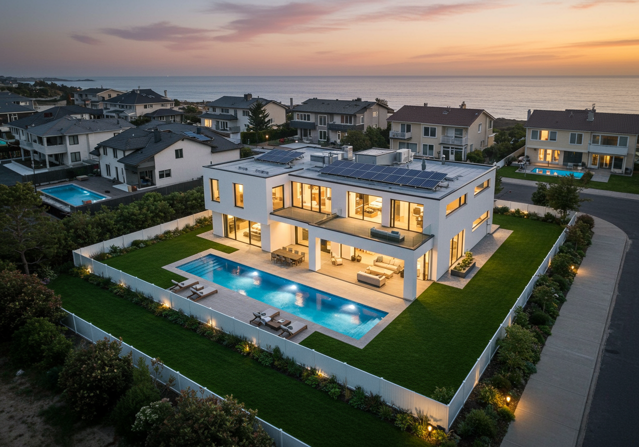This magnificent single-level estate combines ocean views, vast interiors, and private outdoor spaces, representing the pinnacle of custom contemporary architecture on the Southern California coast. Settled on a premier seaside lane in Dana Point’s guard-gated Monarch Bay neighborhood, the vast modern masterpiece overlooks the sweeping Pacific Ocean and whitewater views highlighted by evening lights and gorgeous sunsets.